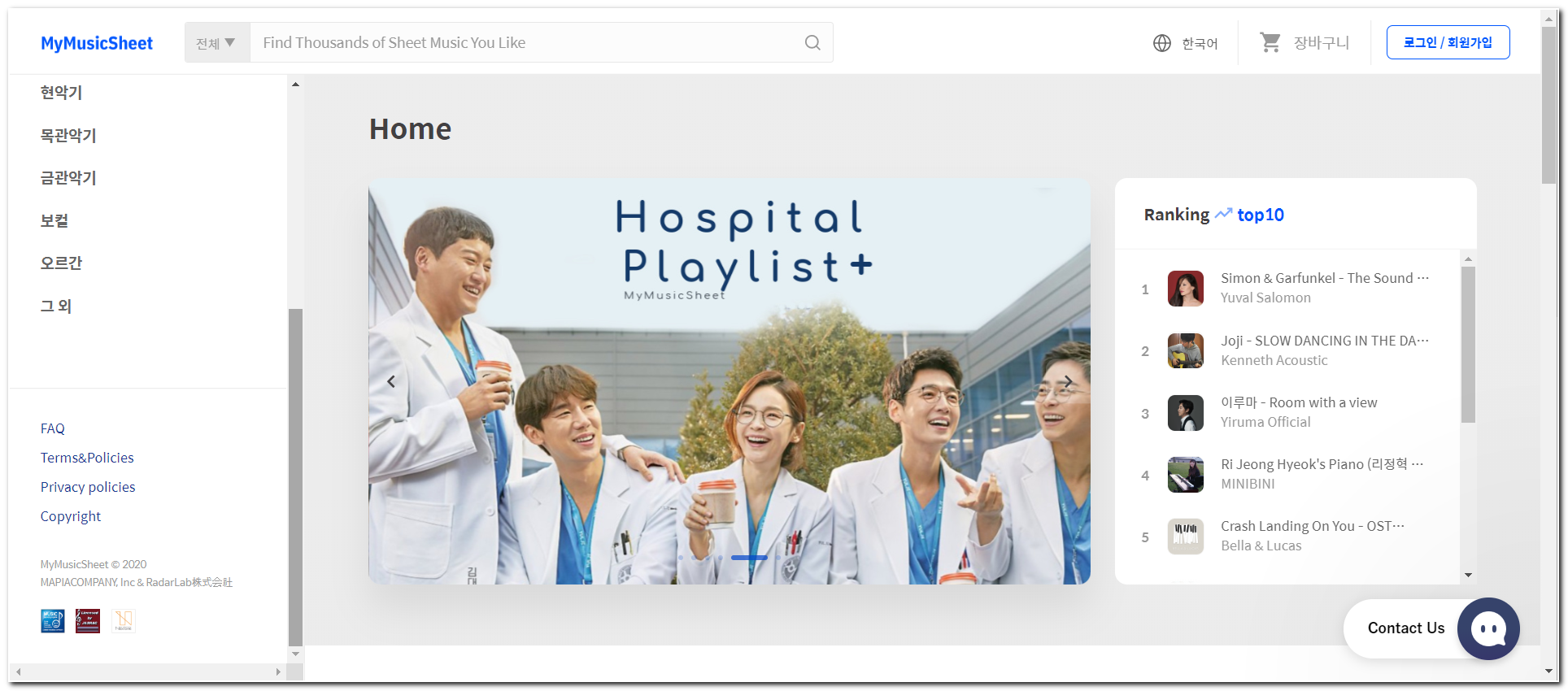 '마피아컴퍼니'의 '마음만은 피아니스트'와 'MyMusicSheet.com'입니다.