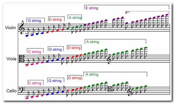 바이올린은 G D A E, 비올라는 저음 쪽에 C현이 하나 추가되어 C G D A, 첼로는 비올라보다 한 옥타브 낮은 C G D A