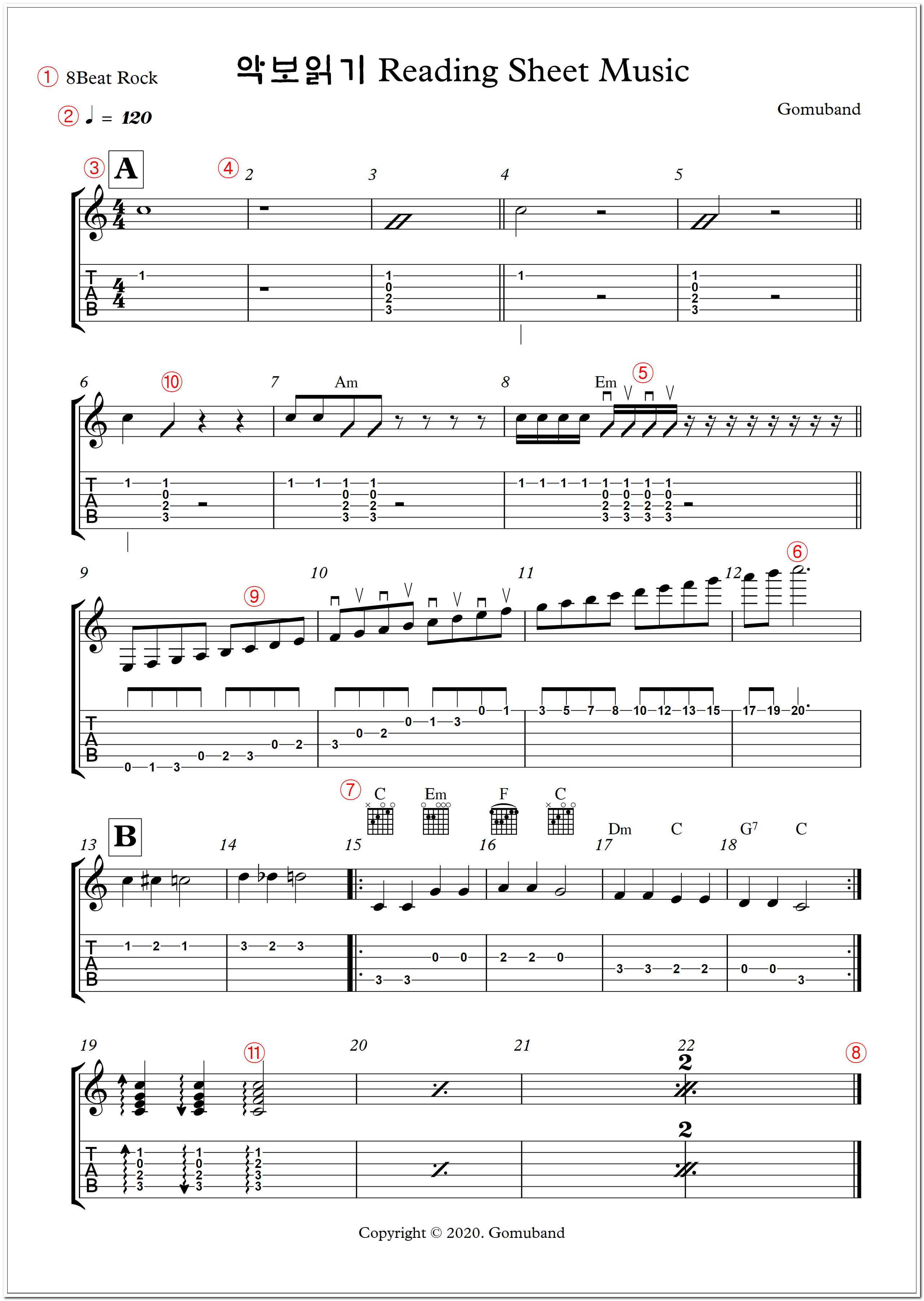 ⑦번은 코드(화음)표시 인데 15번 마디처럼 코드 다이어그램을 함께 그리기도 하고