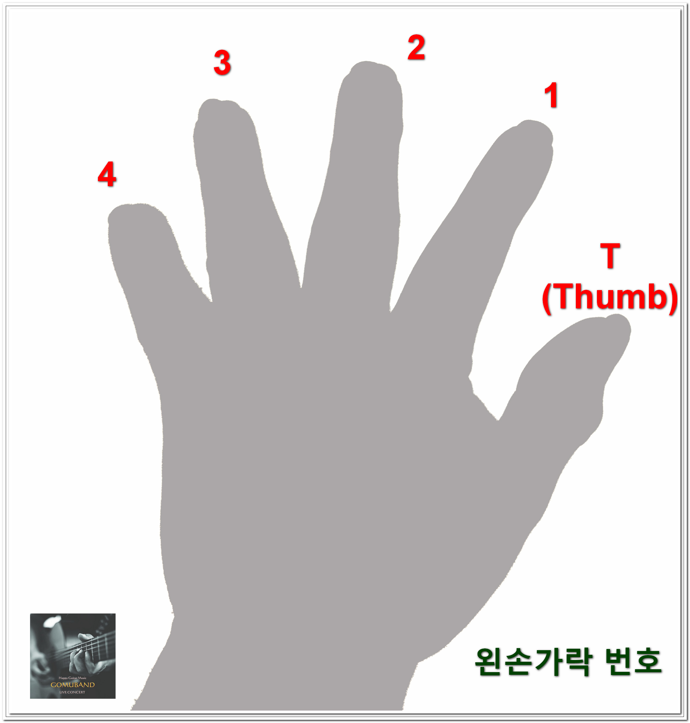 집게손가락 부터 1번, 가운데손가락이 2번, 약손가락이 3번, 새끼손가락이 4번입니다.