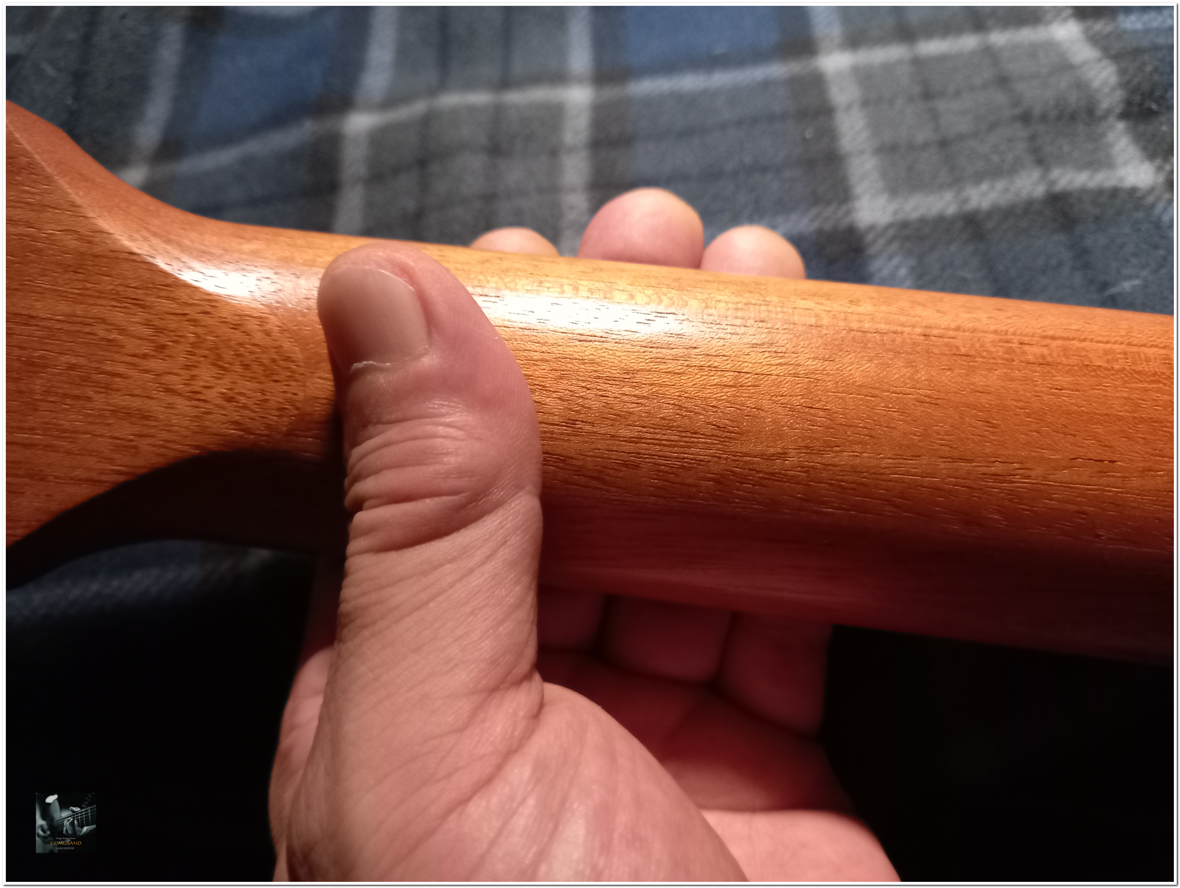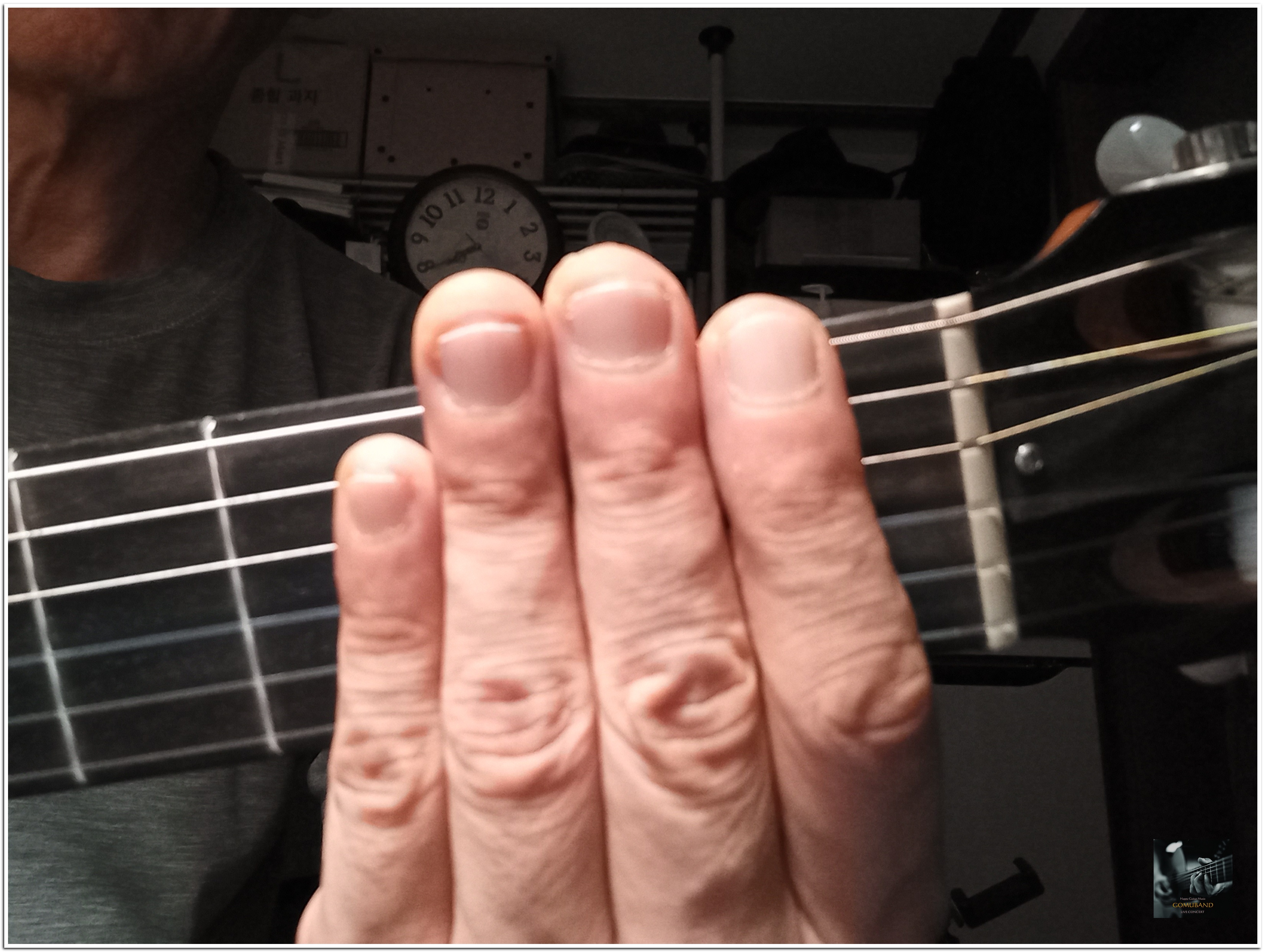 이때 왼손의 엄지손가락은 아래 사진처럼 넥의 중간쯤 가볍게 닿아있으면 됩니다.