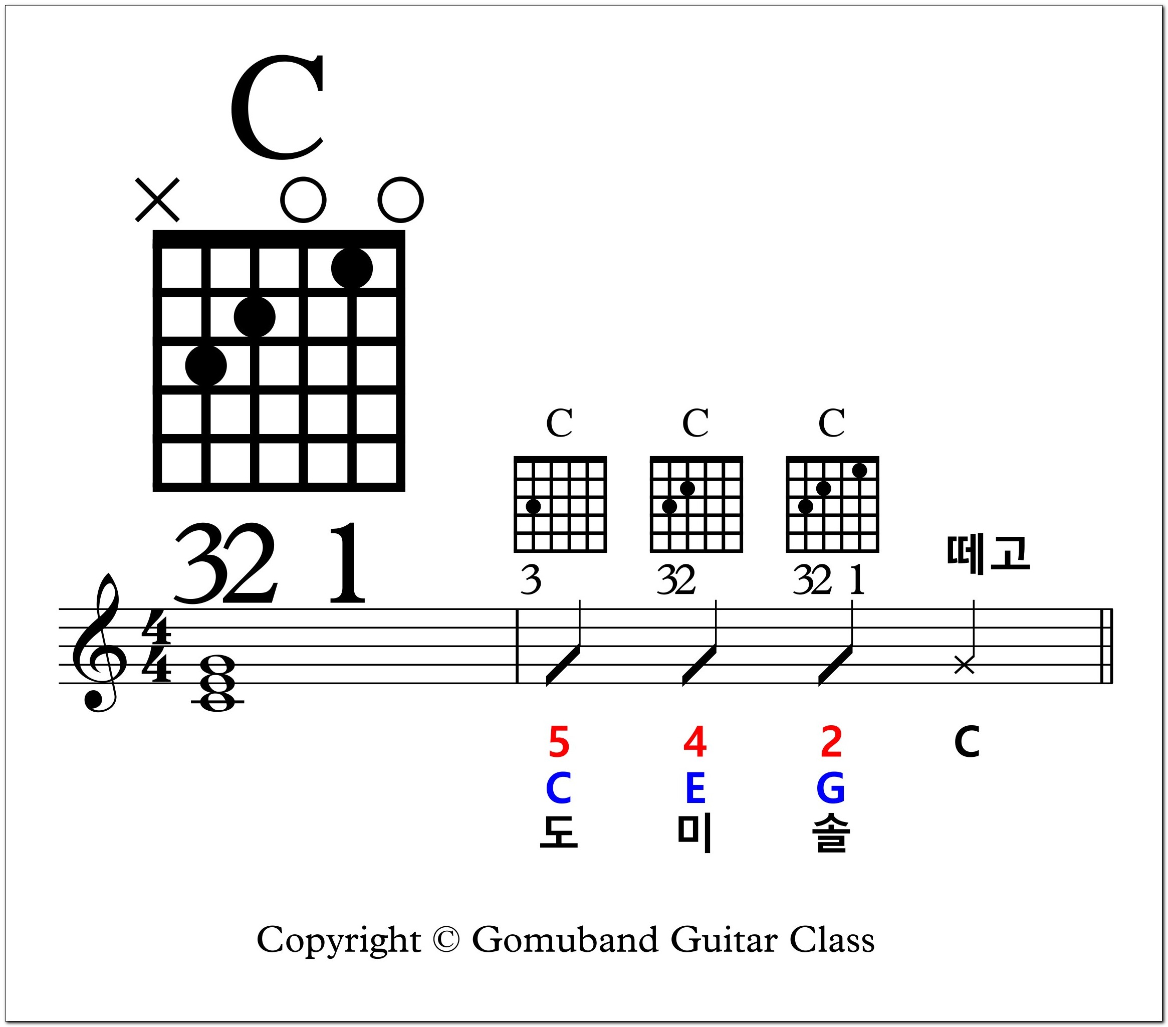 첫째 마디의 음표는 코드의 구성음 음표 둘째 마디의 작은 코드 다이어그램은 왼손가락을 짚어 가는 순서를 표시 둘째 마디의 한 박자 치기는 한 박자 동안 여섯 줄을 전부 치라는 리듬 음표 둘째 마디의 5,4,2라는 숫자는 기타줄 번호 둘째 마디의 C,E,G는 코드의 구성음 둘째 마디의 도,미,솔은 코드의 구성음을 이탈리아어로 적은 것 둘째 마디 위의 '떼고'는 줄은 치되 왼손가락을 프렛에서 떼면서 치라는 것 |