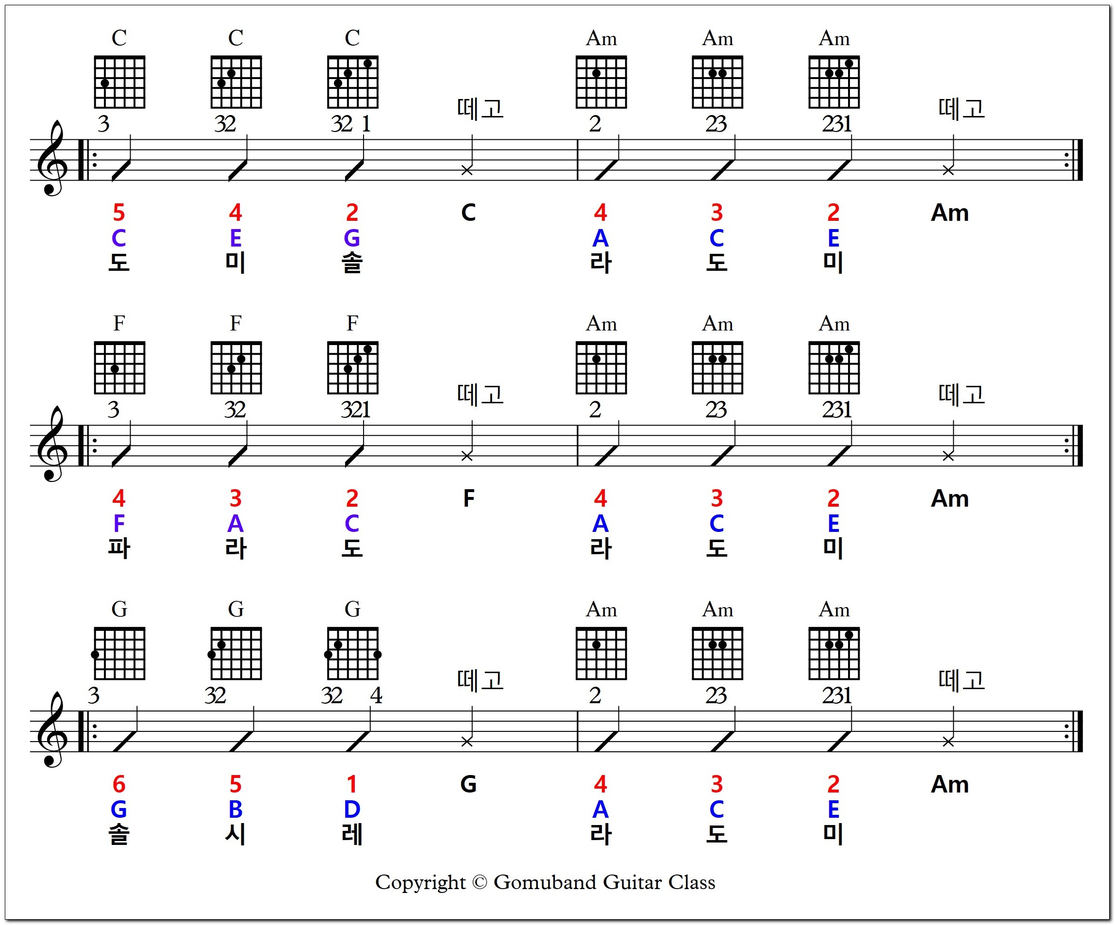 C, G, F 코드 연습하던 방법과 Am 코드 연습하는 방법을 붙이기만 하면 됩니다.