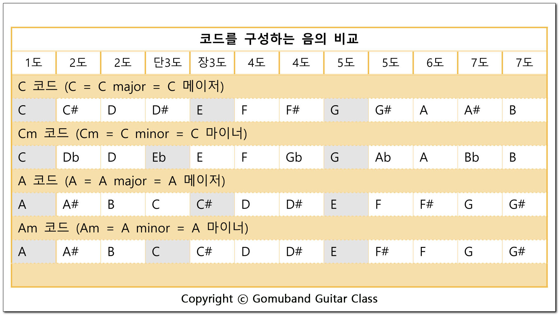 오늘 연습할 Am 코드도 A 메이저 코드에서 가운데 음만 반음 내린 A, C, E가 되는 코드지요.
