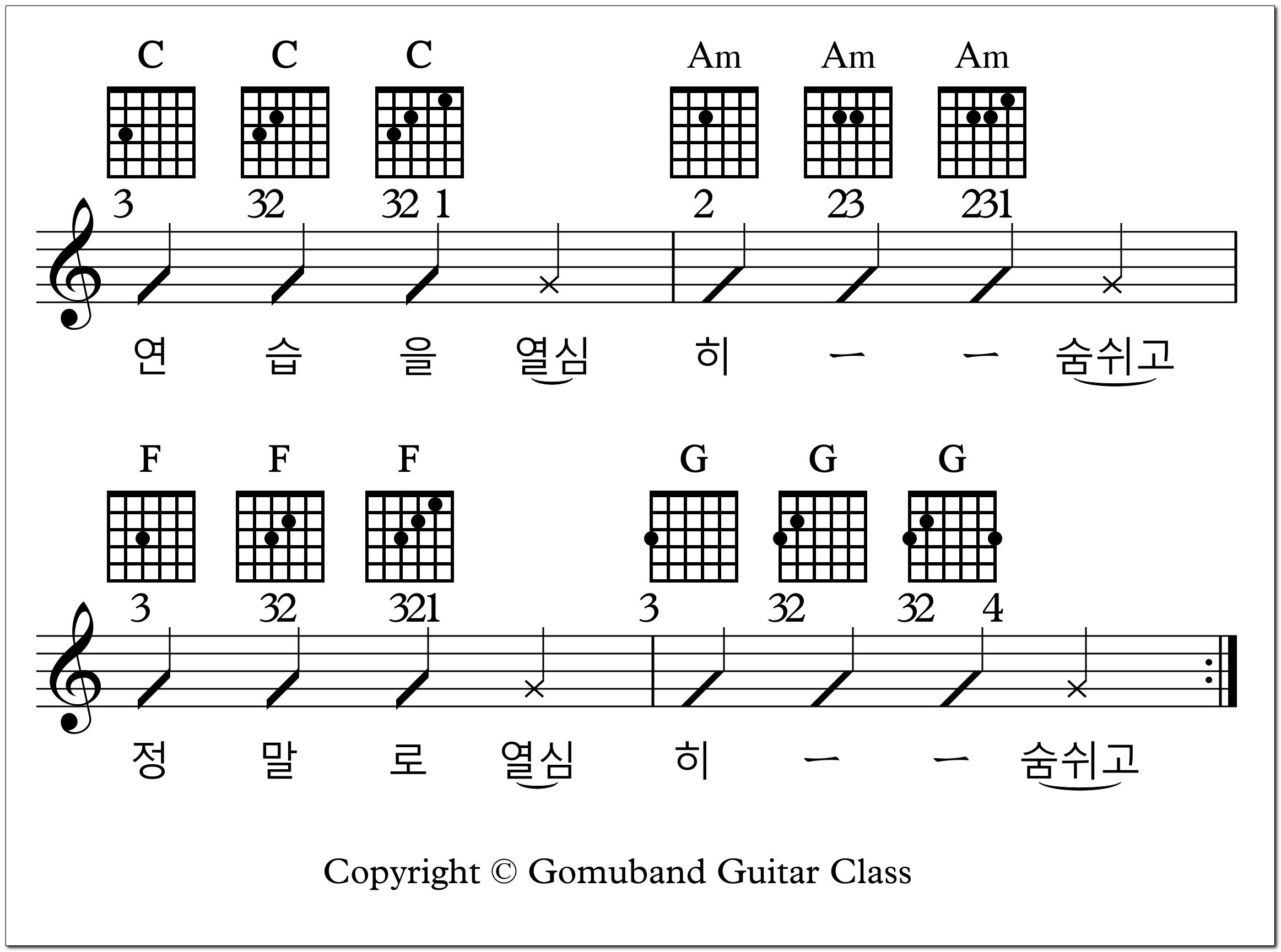 C, G, F 코드 연습하던 방법과 Am 코드 연습하는 방법을 붙이기만 하면 됩니다.