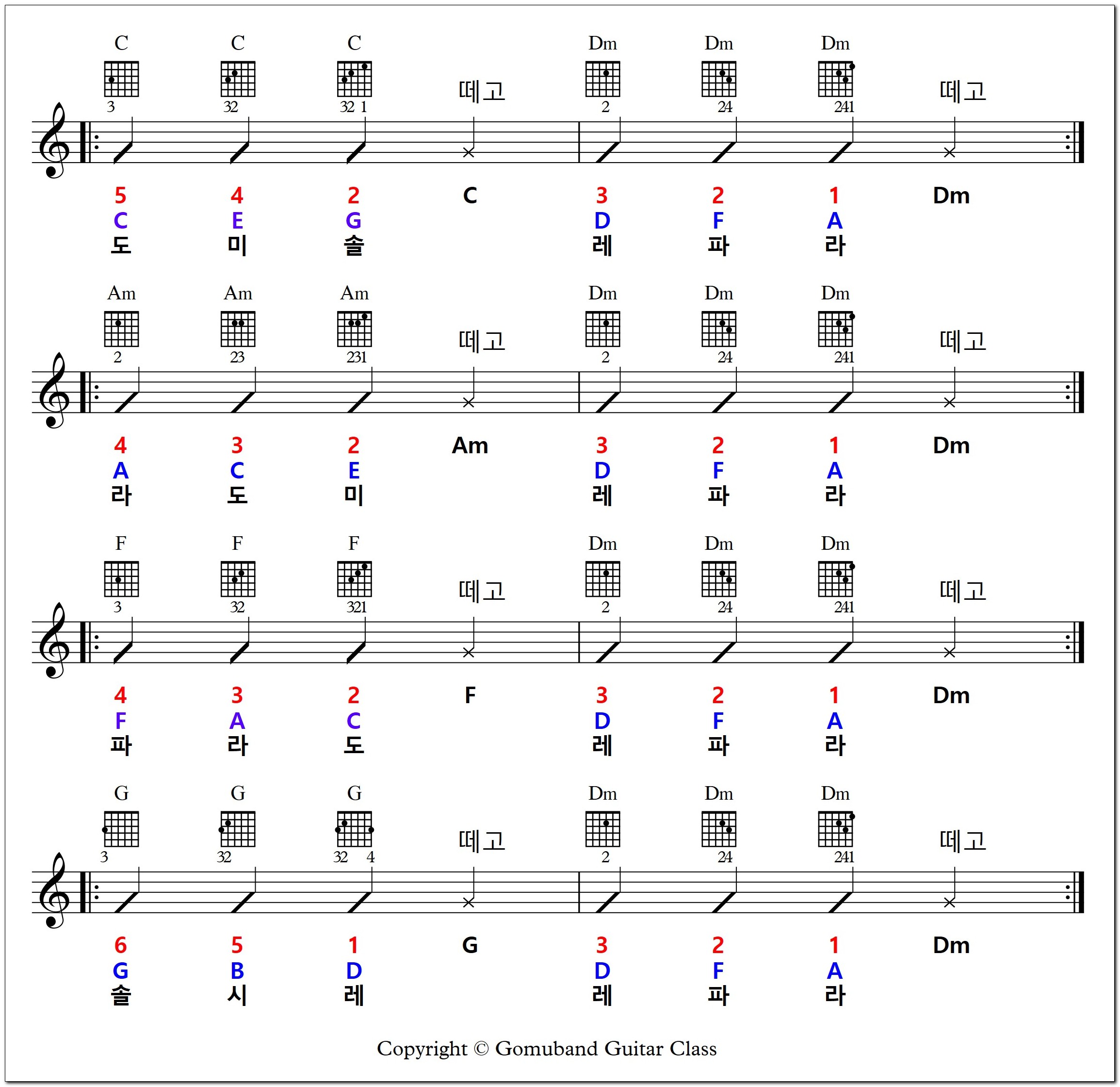 C, G, F, Am 코드 연습하던 방법과 Dm 코드 연습하는 방법을 붙이기만 하면 됩니다.