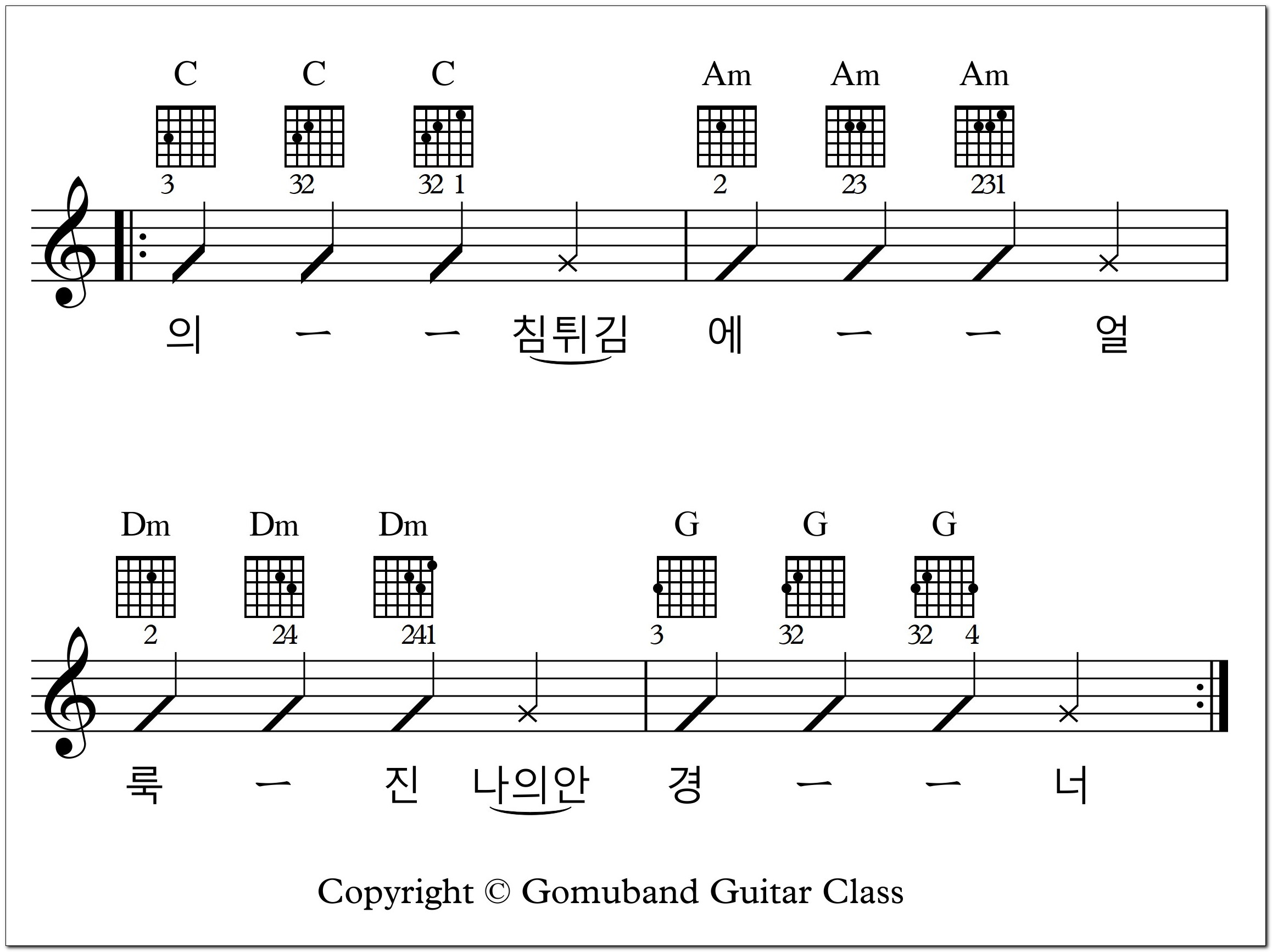 C, G, F, Am 코드 연습하던 방법과 Dm 코드 연습하는 방법을 붙이기만 하면 됩니다.