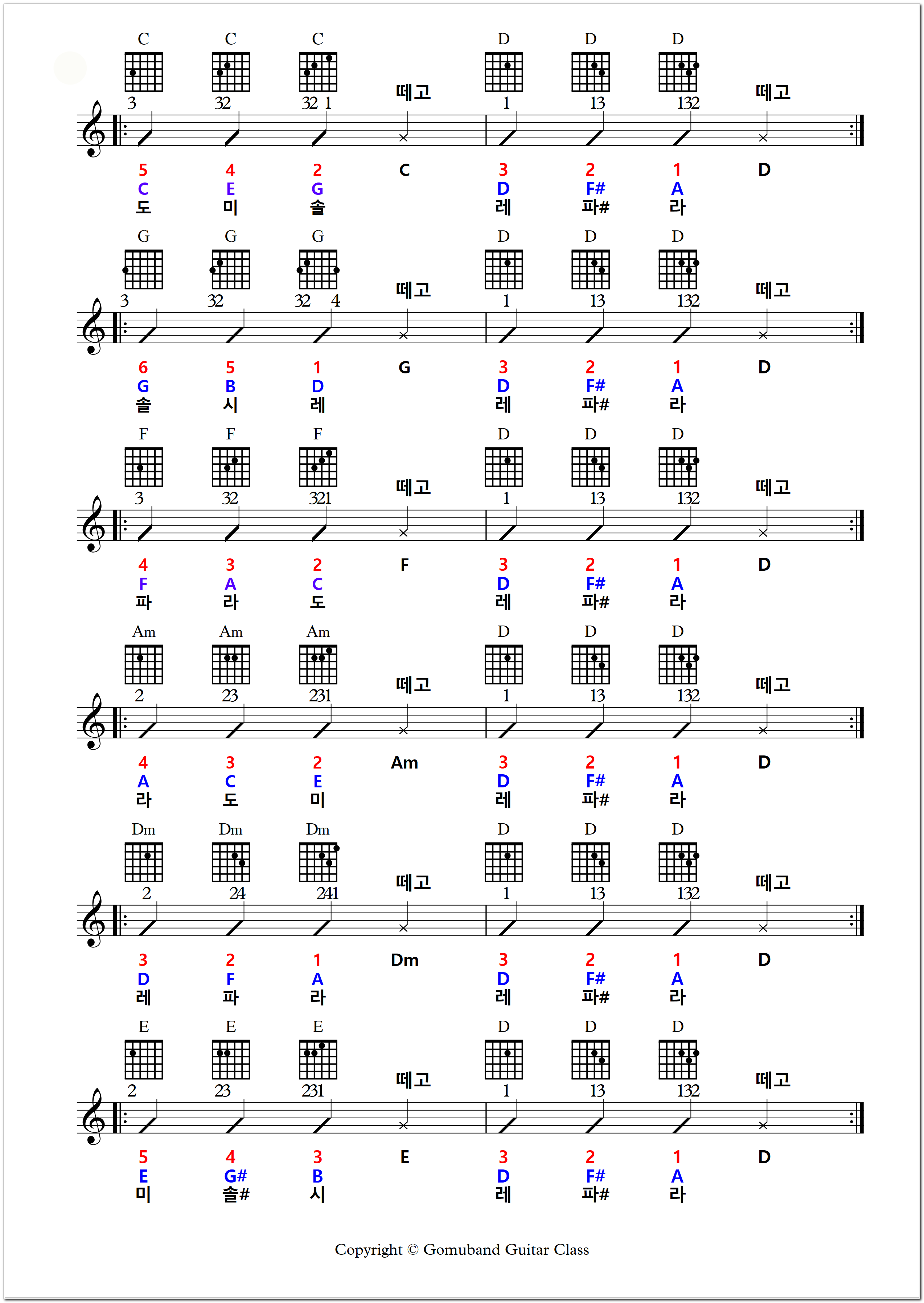 C, G, F, Am, Dm, E 코드 연습하던 방법과 D 코드 연습하는 방법을 붙이기만 하면 됩니다.