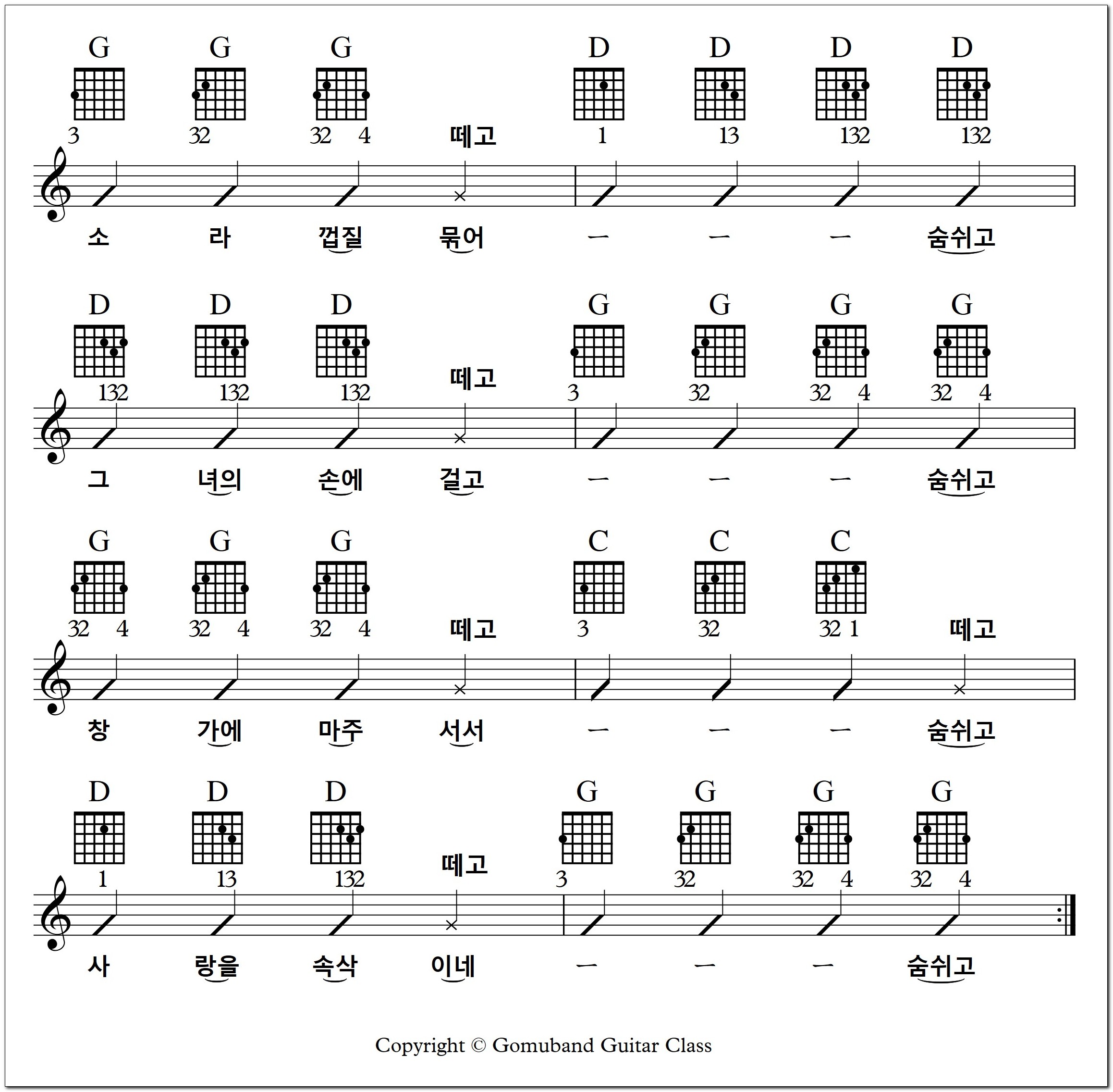 6, 5, 1, G(떼고), 3, 2, 1, D(떼고) 이 두 마디가 잘 되면 C, D, G, D 네 마디를 반복 연습하세요.