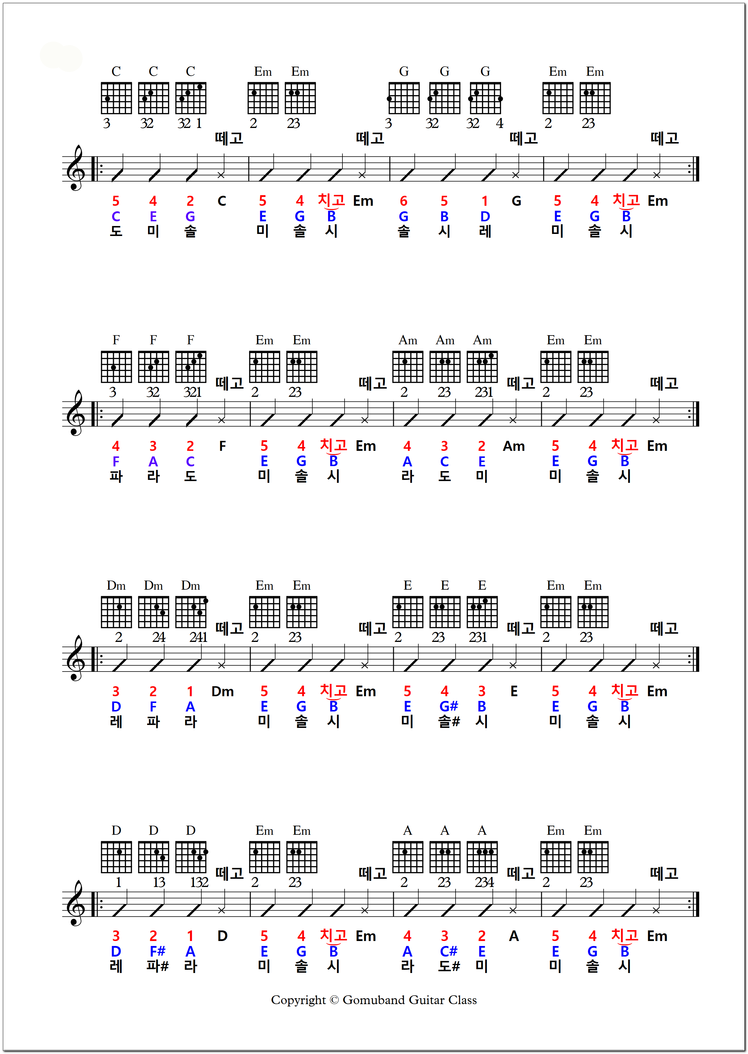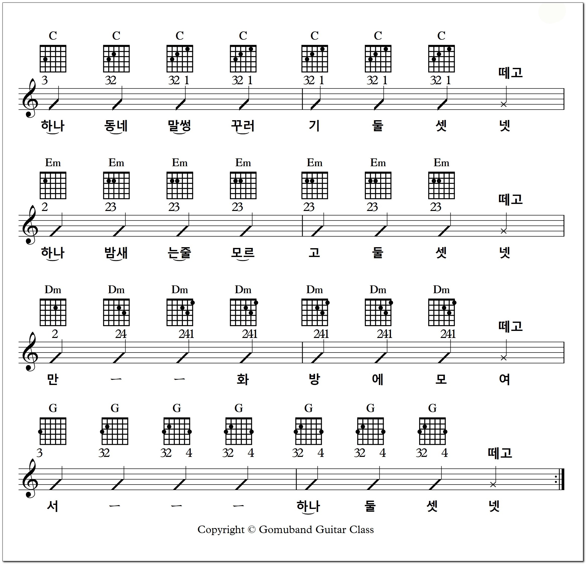 5, 4, 2, C(떼고), 5, 4, 치고, Em(떼고), 6, 5, 1, G(떼고), 5, 4, 치고, Em(떼고) 이 네 마디가 잘 되면 다음 줄로 넘어가세요.
