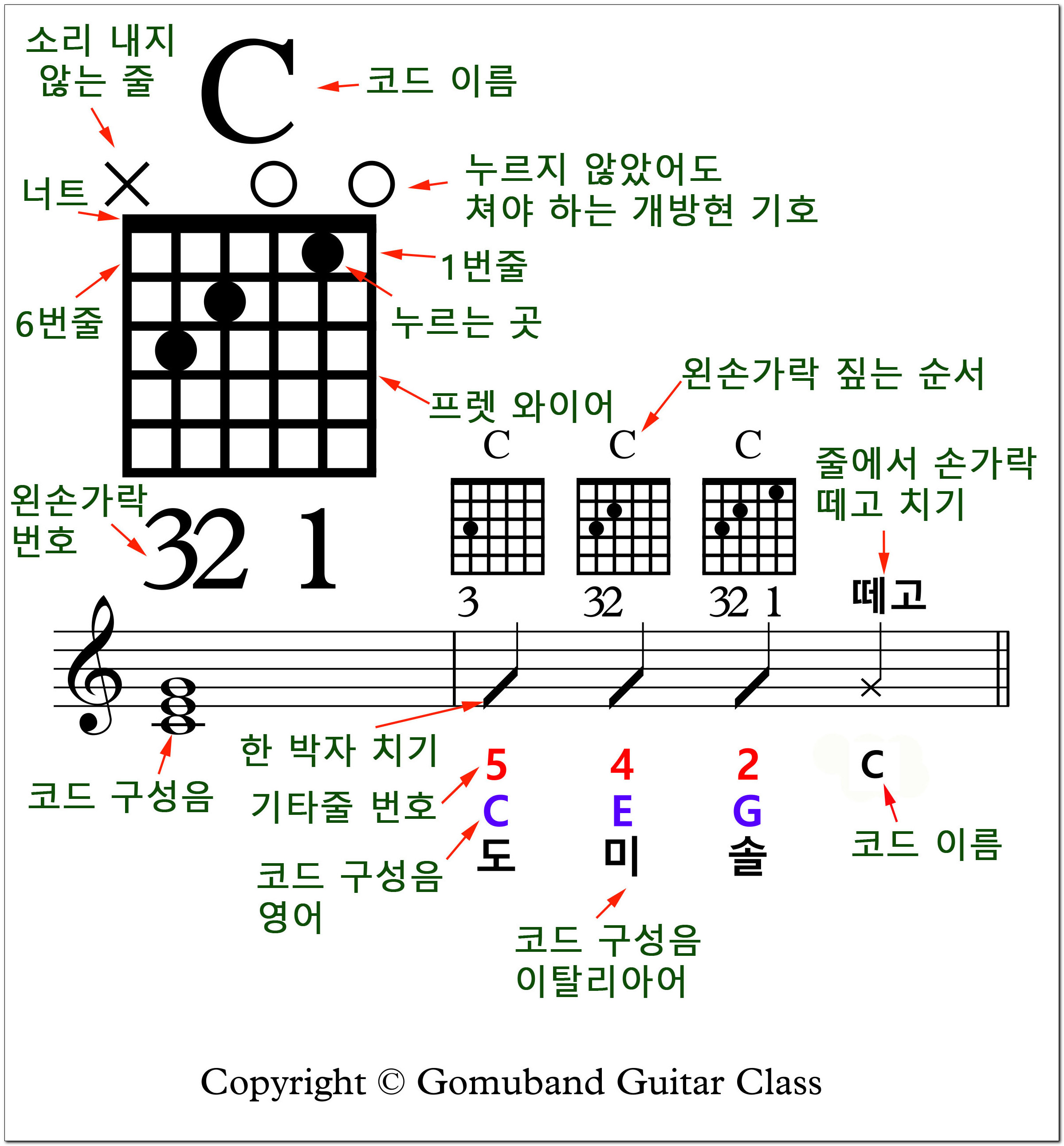 첫째 마디의 음표는 코드의 구성음 음표 둘째 마디의 작은 코드 다이어그램은 왼손가락을 짚어 가는 순서를 표시 둘째 마디의 한 박자 치기는 한 박자 동안 여섯 줄을 전부 치라는 리듬 음표 둘째 마디의 5,4,2라는 숫자는 기타줄 번호 둘째 마디의 C,E,G는 코드의 구성음 둘째 마디의 도,미,솔은 코드의 구성음을 이탈리아어로 적은 것 둘째 마디 위의 '떼고'는 줄은 치되 왼손가락을 프렛에서 떼면서 치라는 것 |