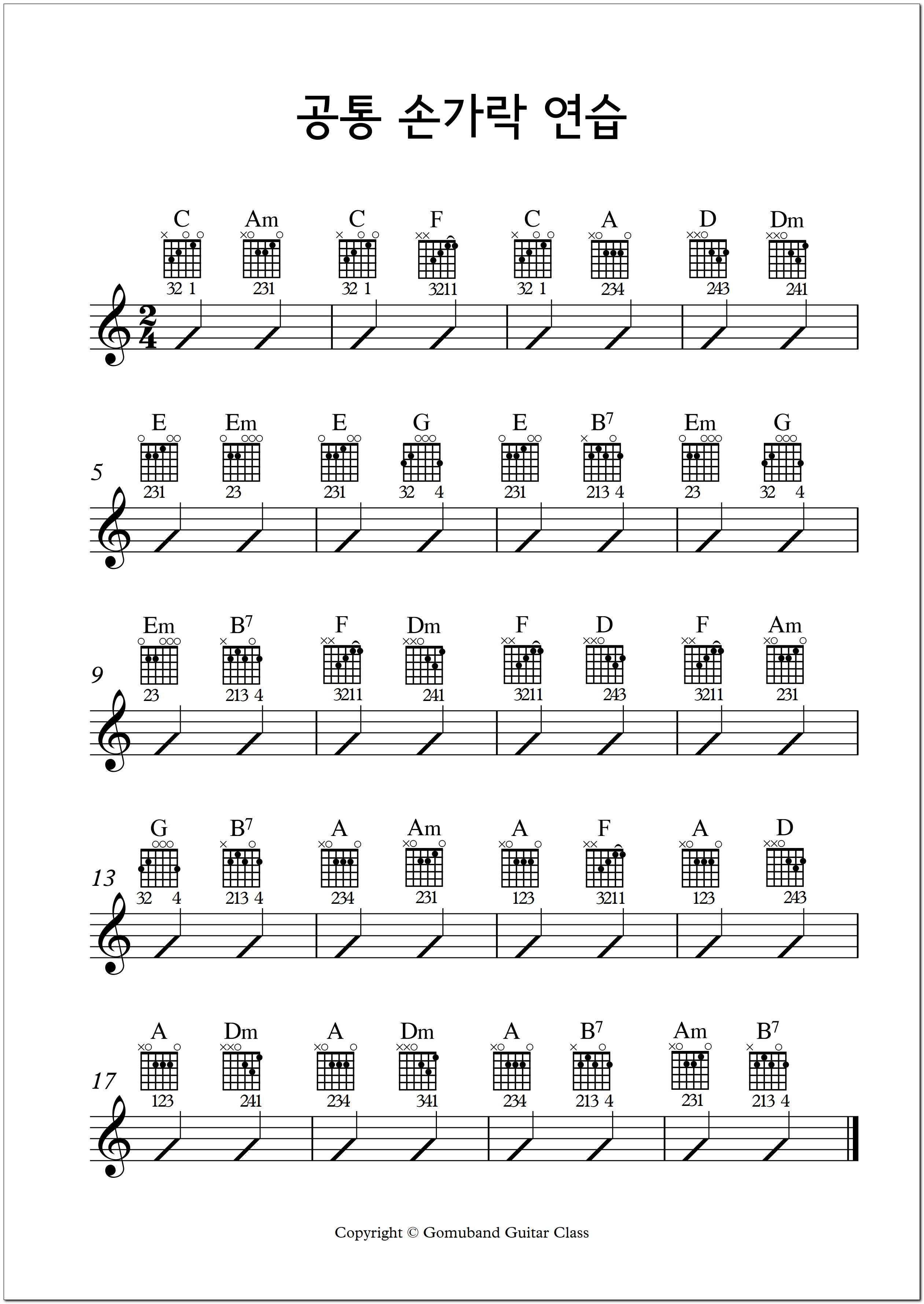 ▶ 지금부터 연습할 때는 공통으로 누르는 손가락을 떼지 않고 여섯 줄을 치면 됩니다.