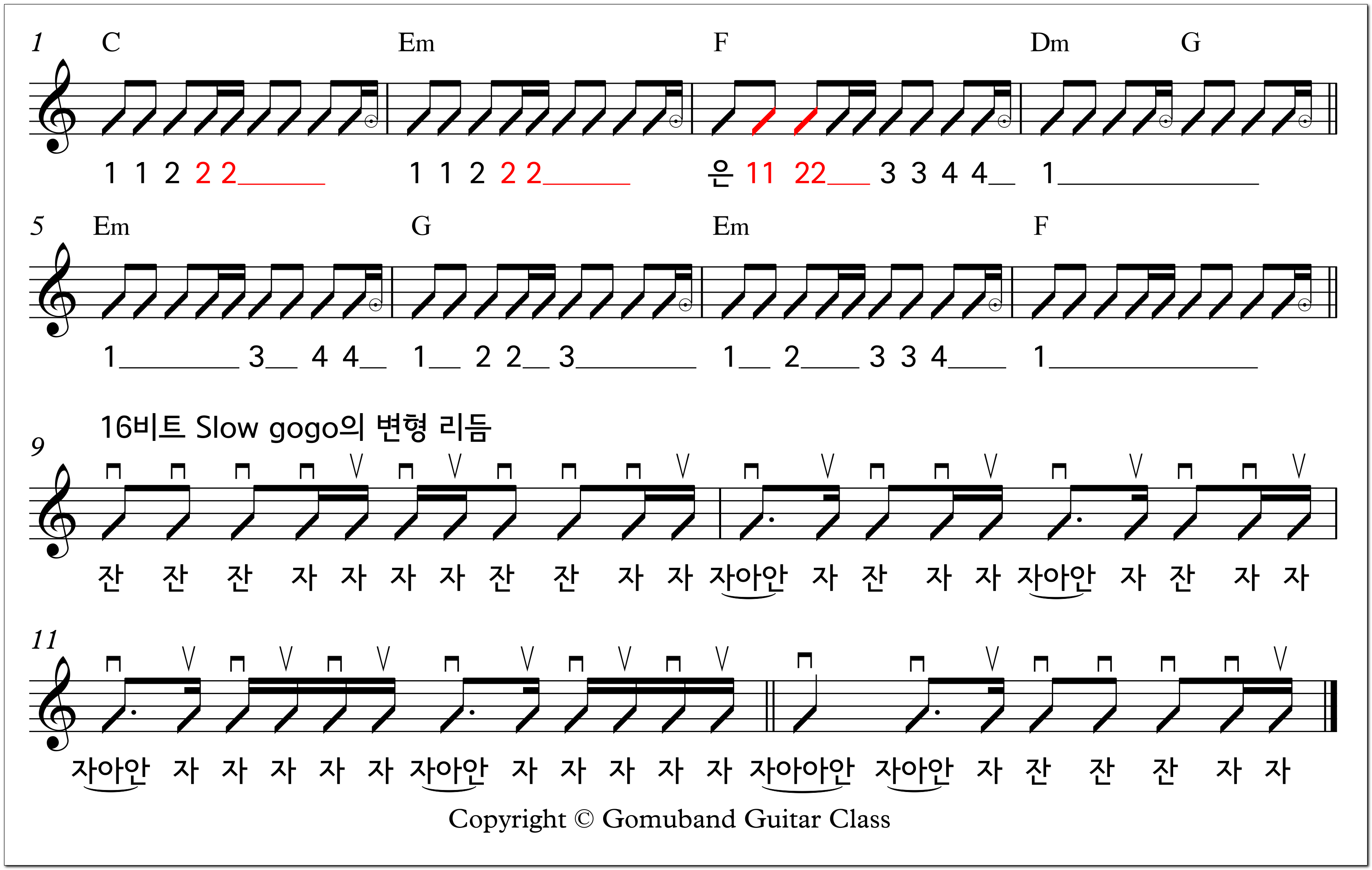 ● 아래 악보는 느린 16비트 코드 바꾸기 연습입니다.