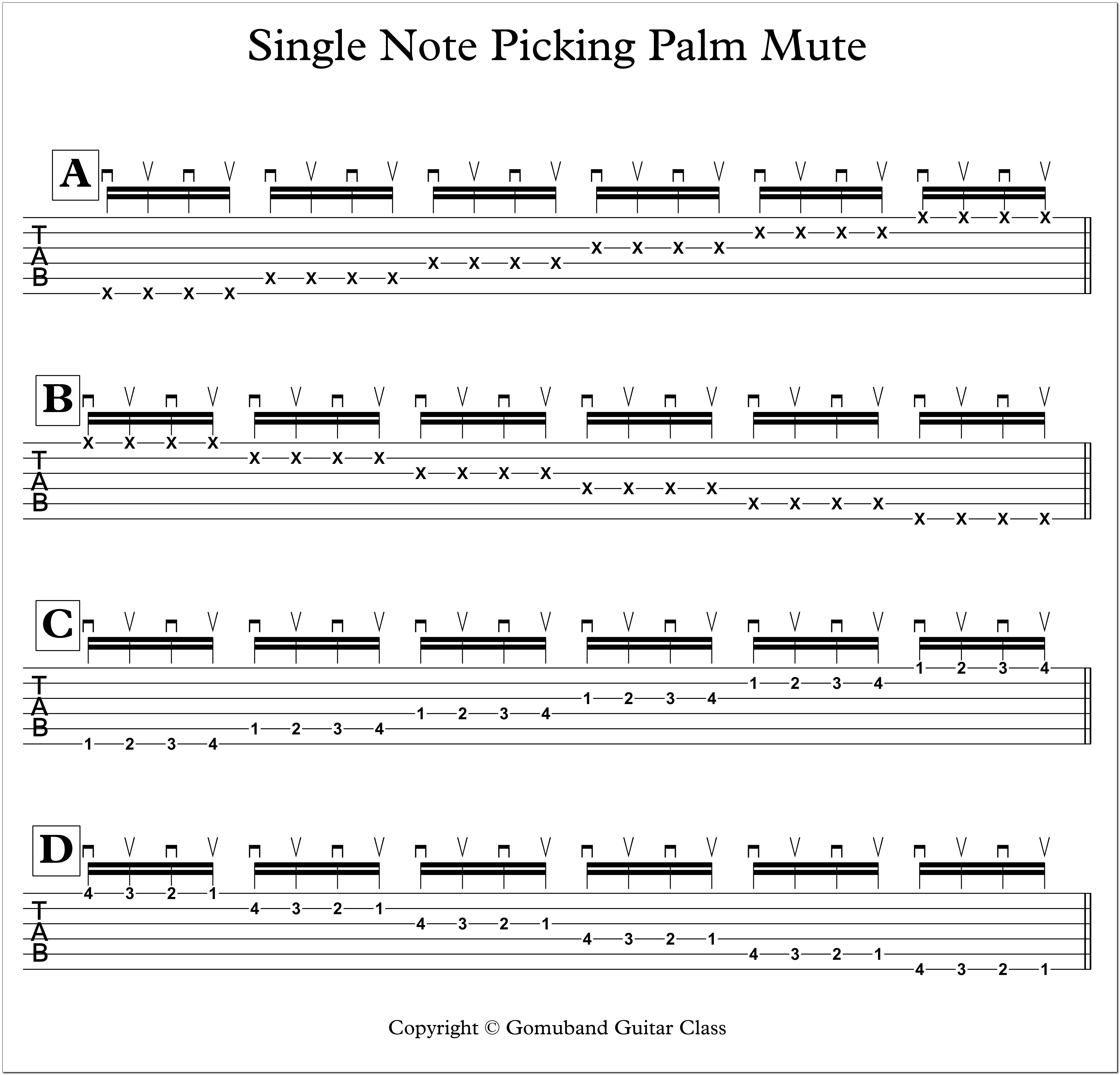 ⑦ 연습기호 A와 B의 모든 박자를 오픈/팜 뮤트를 반복해서 연습하세요.