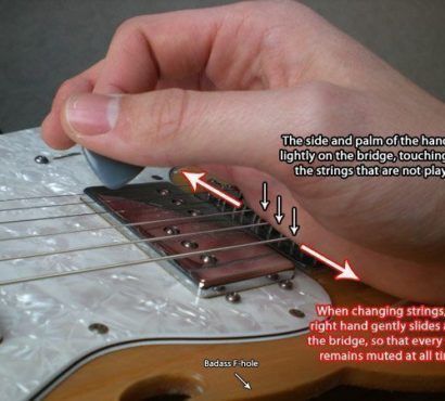 저음 줄에서 고음 줄로 단음을 치며 올라갈 때 저음 줄의 울림을 팜 뮤트로 막을 수 있어요.
