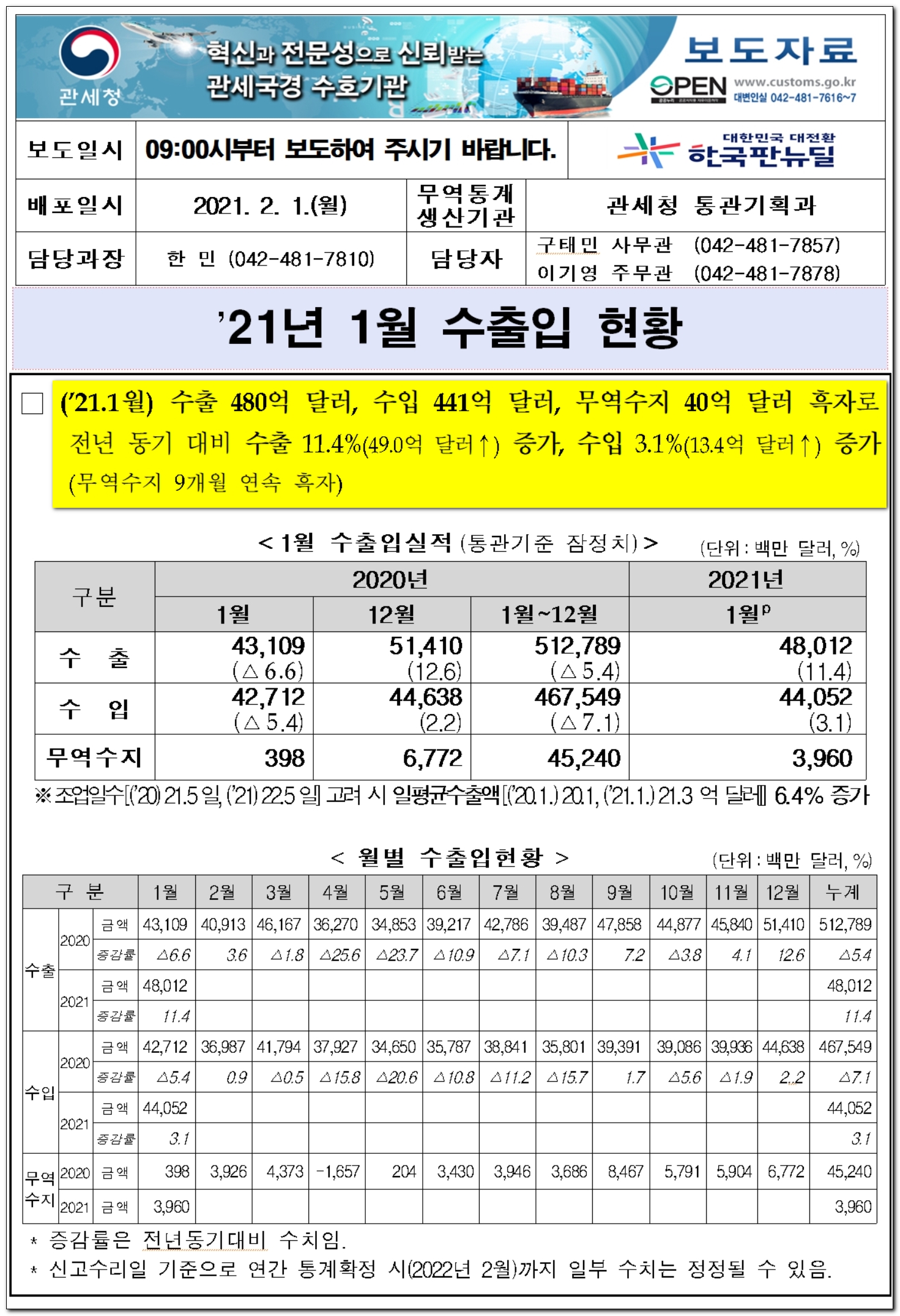 아래 관세청 통관기획과의 보도자료에는 무역수지 40억 달러 흑자! 라고 대문짝만하게 쓰여있죠.