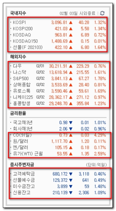 오른쪽에 우리나라, 외국 증권시장 상황, 중간에 환율, 맨 아래는 시장에 와서 대기 중인 예탁금 등이 있어요.