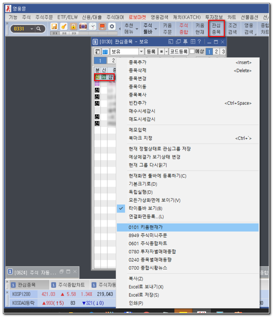 툴바의 '주식' 메뉴에서 첫 번째 '키움현재가'와 네 번째 '관심종목'눌러서 창 두 개를 열어요.