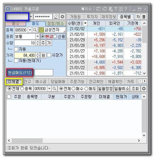 주문을 넣고 기다려도 아무 소식이 없으면 위의 위 그림 '키움주문'창의 '미체결'(노란 사각형)을 보세요.