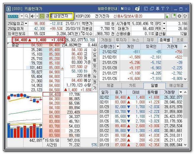 현재 삼성전자 1주 가격은 84,400원이고 1,400원 1.69% 올랐네요.