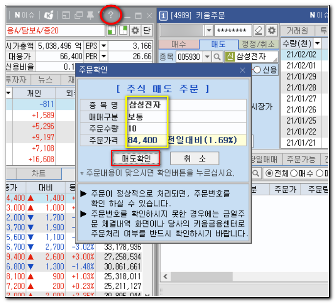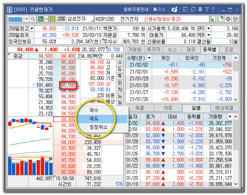 매수, 매도, 정정취소 메뉴(노란 원)가 열려요.