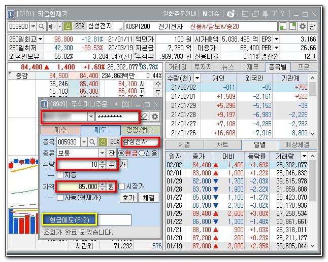 '매도'를 누르면 '주식미니주문'창이 열려요.