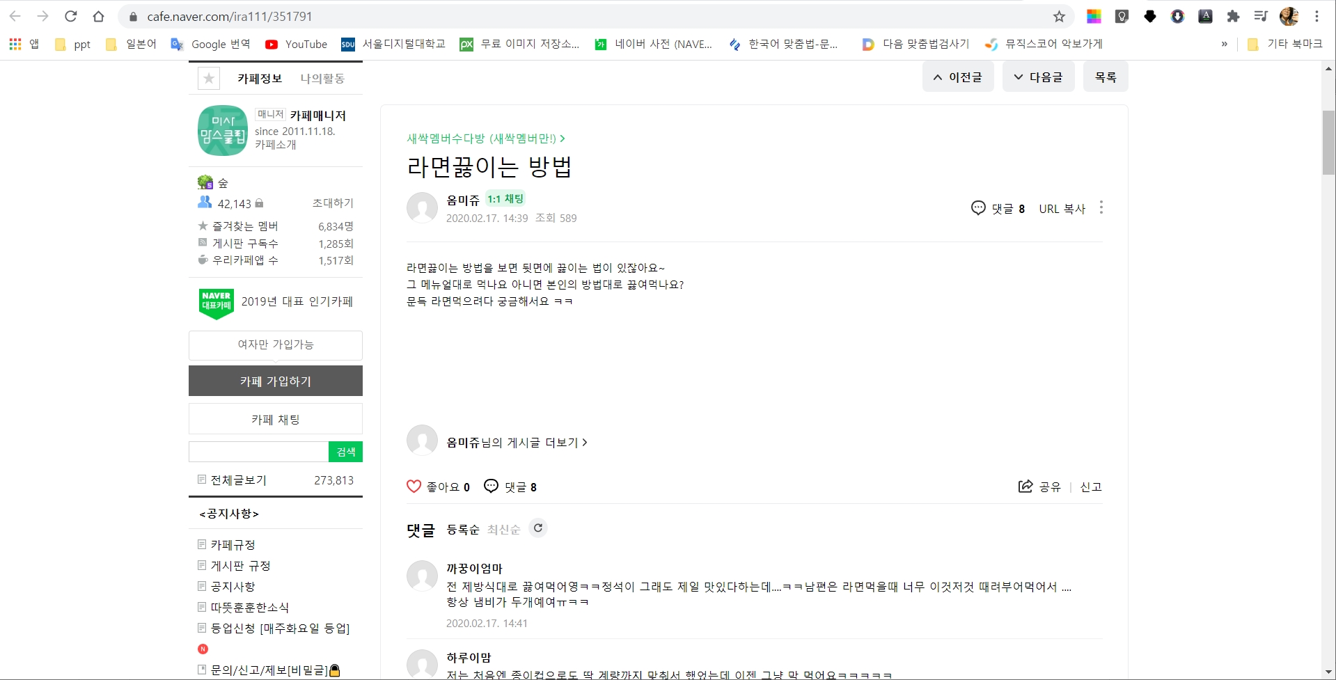 질문과 댓글이 있는 카페의 한 페이지가 떴다.