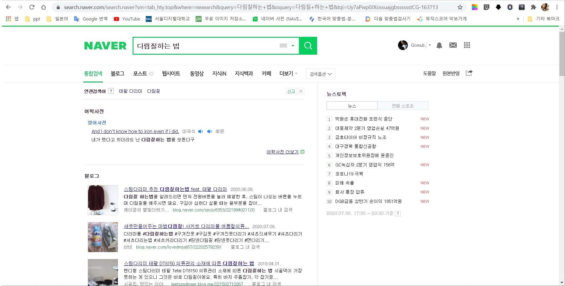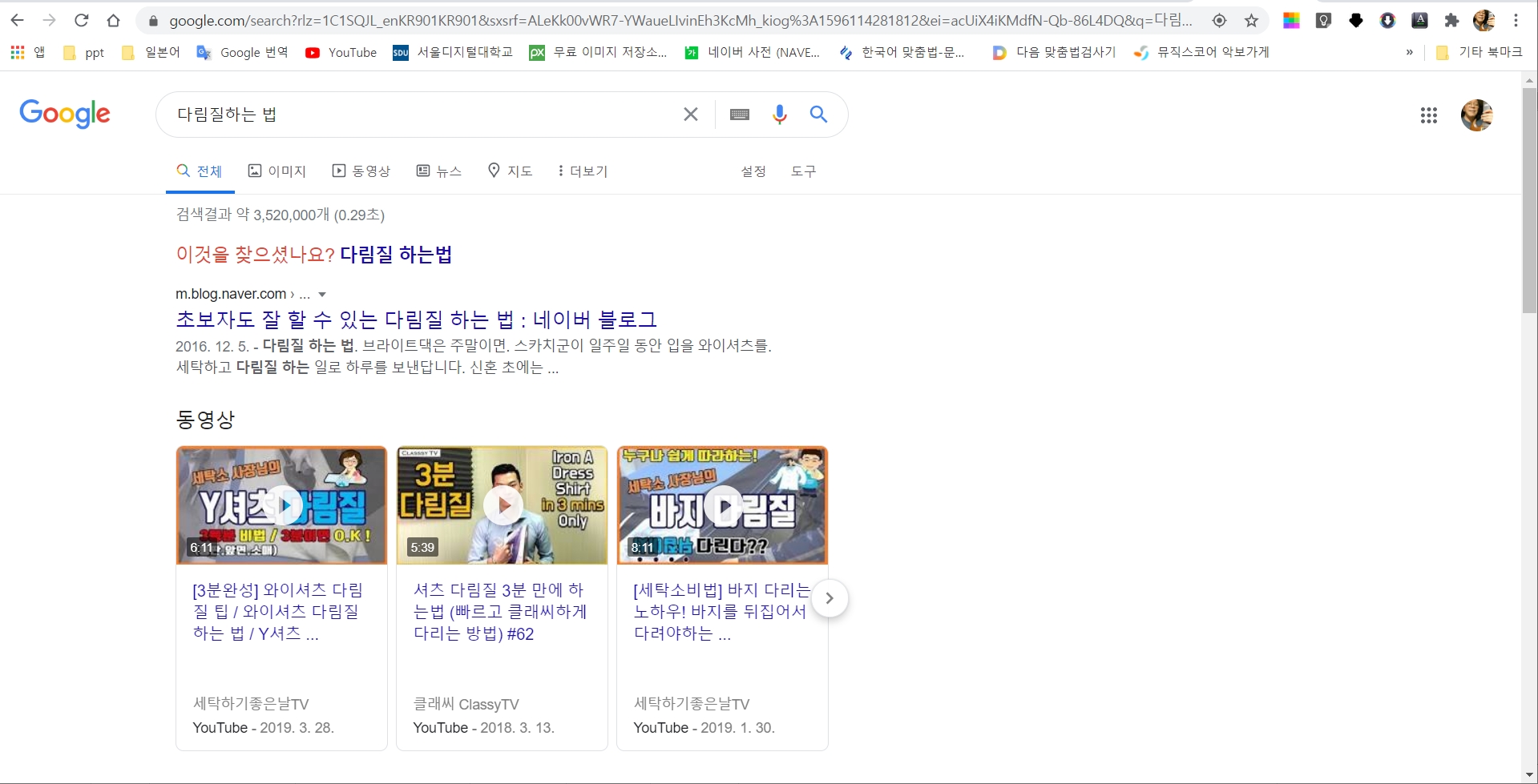 다음에서는 '다림질 하는 법'으로 찾으면 결과가 달라진다.